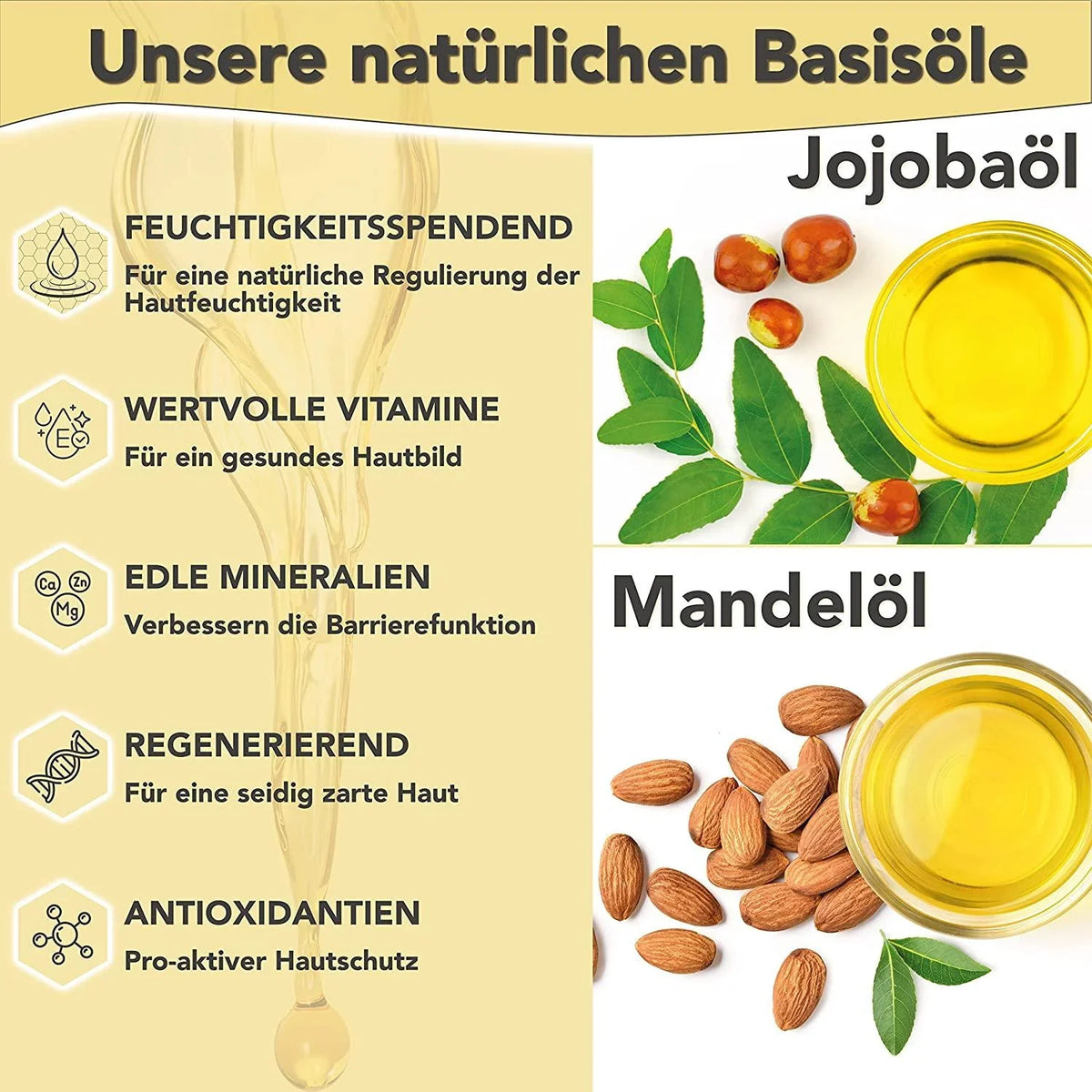 Jojobaöl und Mandelöl gelten als besonders hautverträglich und sind auch für empfindliche Haut geeignet. Vitamin E wirkt antioxidativ und unterstützt die Hautregeneration. Das Massageöl ist frei von künstlichen Zusätzen und wird in Deutschland unter höchsten Qualitätsstandards hergestellt.