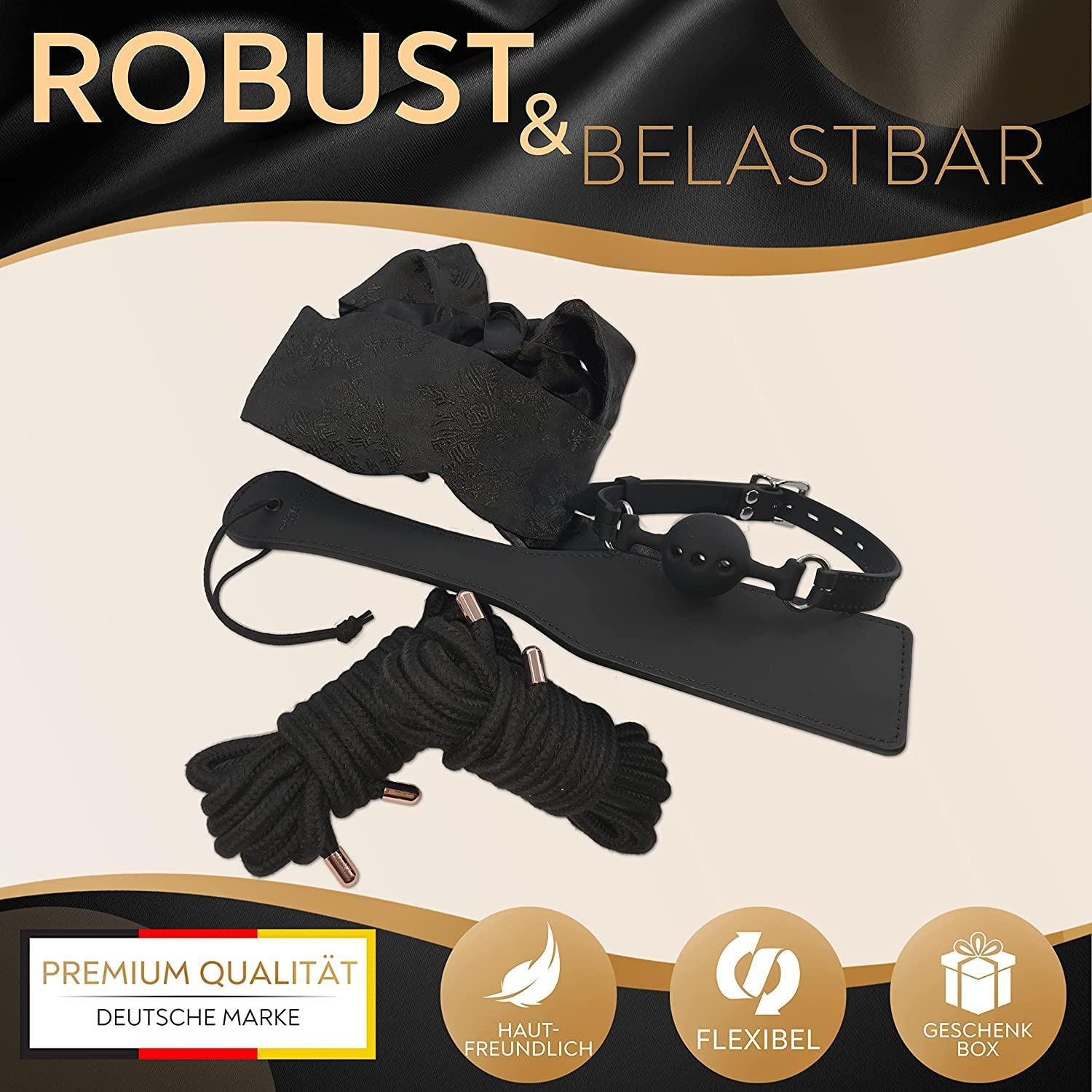 - Umfassendes Set: Enthält 2 Bondage-Seile (jeweils 5m), einen Ballgag, ein Paddel und eine Augenmaske für vielseitige Fesselspielmöglichkeiten.