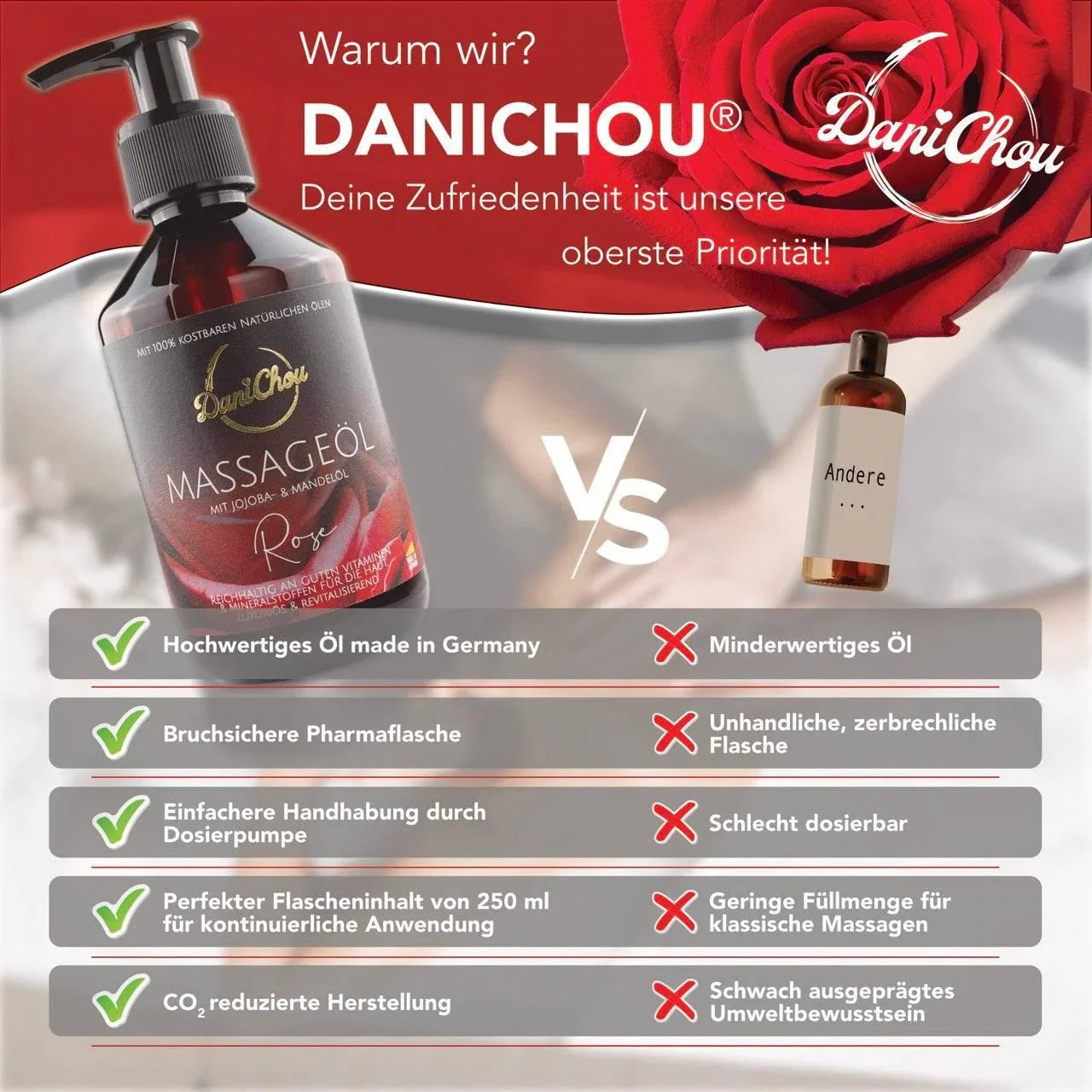 Our DaniChou massage oils are produced by a renowned manufacturer in Germany and represent the highest quality and natural cosmetics. Visit our shop and discover the ideal massage oil for your skincare routine. The luxurious combination of almond and jojoba oils transforms every massage into an unforgettable experience, leaving your skin soft, supple, and beautifully nourished.