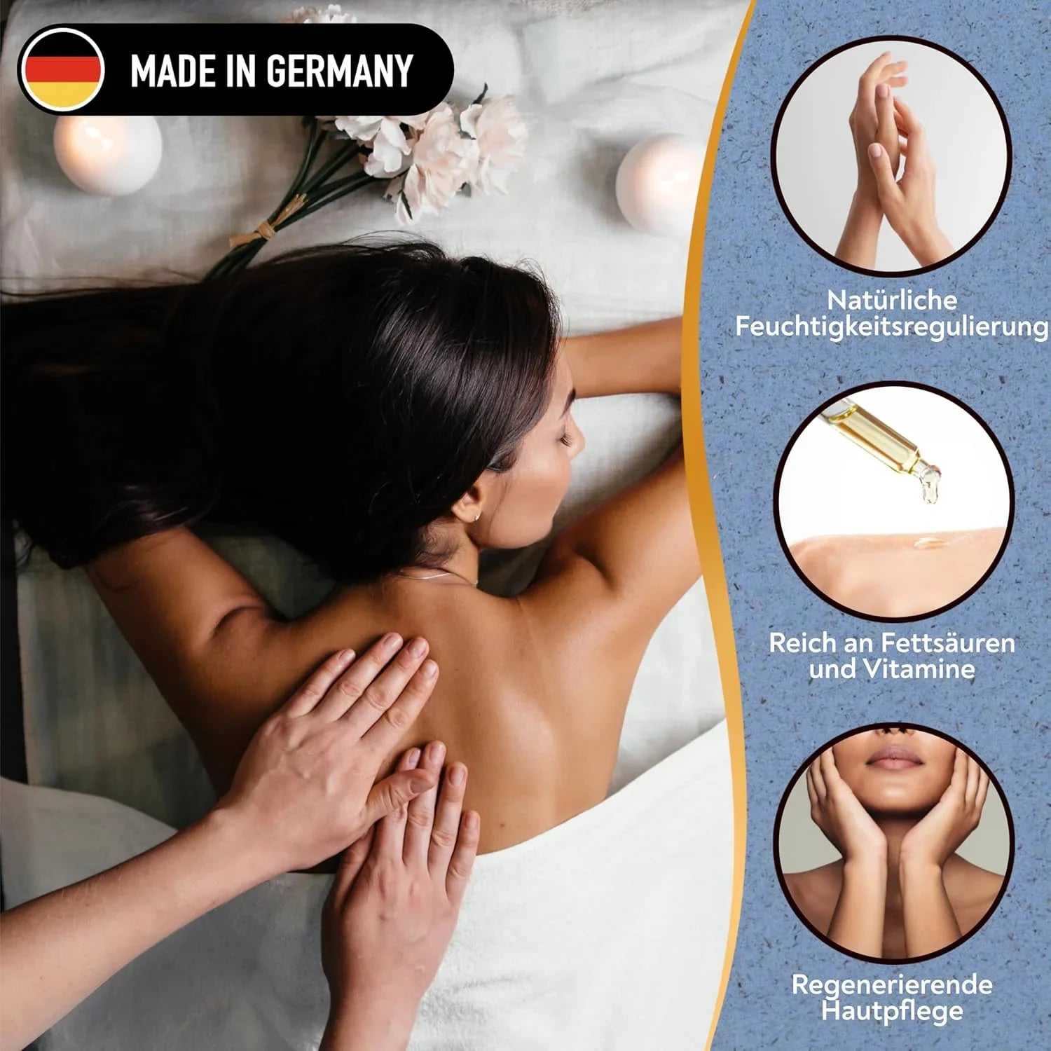 Nourishing body and massage oil with almond and jojoba oil, vitamin E, and a tropical coconut scent – ​​for supple skin, relaxation, and moments of well-being at home. Naturally produced in Germany for the highest quality and purity.
