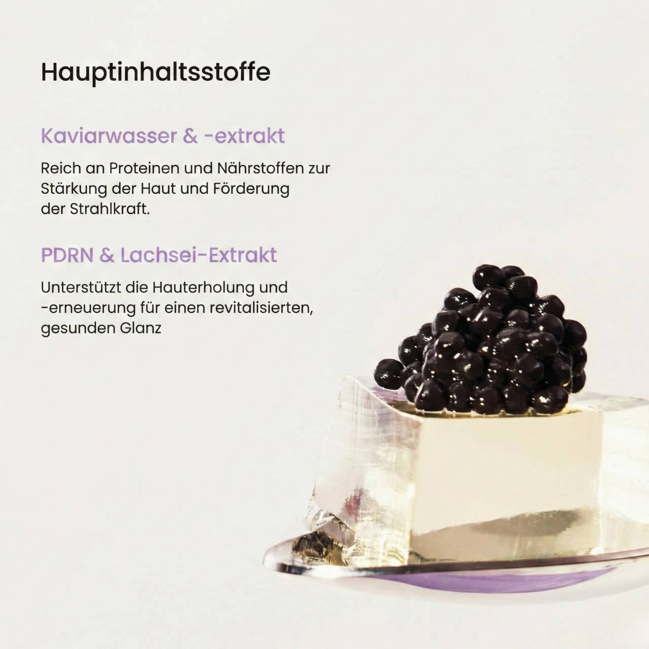 Caviar Water, Water, Glycerin, Dipropylene Glycol, Cetyl Ethylhexanoate, 1,2-Hexanediol, Niacinamide, Propylene Glycol Dibenzoate, Chondrus Crispus Extract, Ceratonia Siliqua (Carob) Gum, Butyrospermum Parkii (Shea) Butter, Hydroxyacetophenone, Polyglyceryl-3 Methylglucose Distearate, Potassium Chloride, Algin, Chondrus Crispus Powder, Polyacrylate-13, Allantoin, Glyceryl Stearate, Cellulose Gum, Glucomannan, Xanthan Gum, Ethylhexyl Olivate, Eclipta Prostrata Extract, Sucrose, Ethylhexylglycerin, Hydrogenated Polyisobutene, Sodium Acrylates Copolymer, Sodium Polyacryloyldimethyl Taurate, Adenosine, Melia Azadirachta Leaf Extract, Sodium Phytate, Polyglyceryl-4 Oleate, Polyglyceryl-10 Laurate, Ethylhexyl Palmitate, Melia Azadirachta Flower Extract, Pyrus Communis (Pear) Fruit Extract, Sorbitan Isostearate, Rosa Damascena Flower Water, Sodium Polyacrylate, Coccinia Indica Fruit Extract, Caviar Extract, Salmon Egg Extract, Iris Florentina Root Extract, Cucumis Melo (Melon) Fruit Extract, Moringa Oleifera Seed Oil, Hedera Helix (Ivy) Leaf/Stem Extract, Solanum Melongena (Eggplant) Fruit Extract, Aloe Barbadensis Flower Extract, Simmondsia Chinensis (Jojoba) Seed Oil, Ocimum Sanctum Leaf Extract, Curcuma Longa (Turmeric) Root Extract, Corallina Officinalis Extract, Tocopherol, Sodium DNA