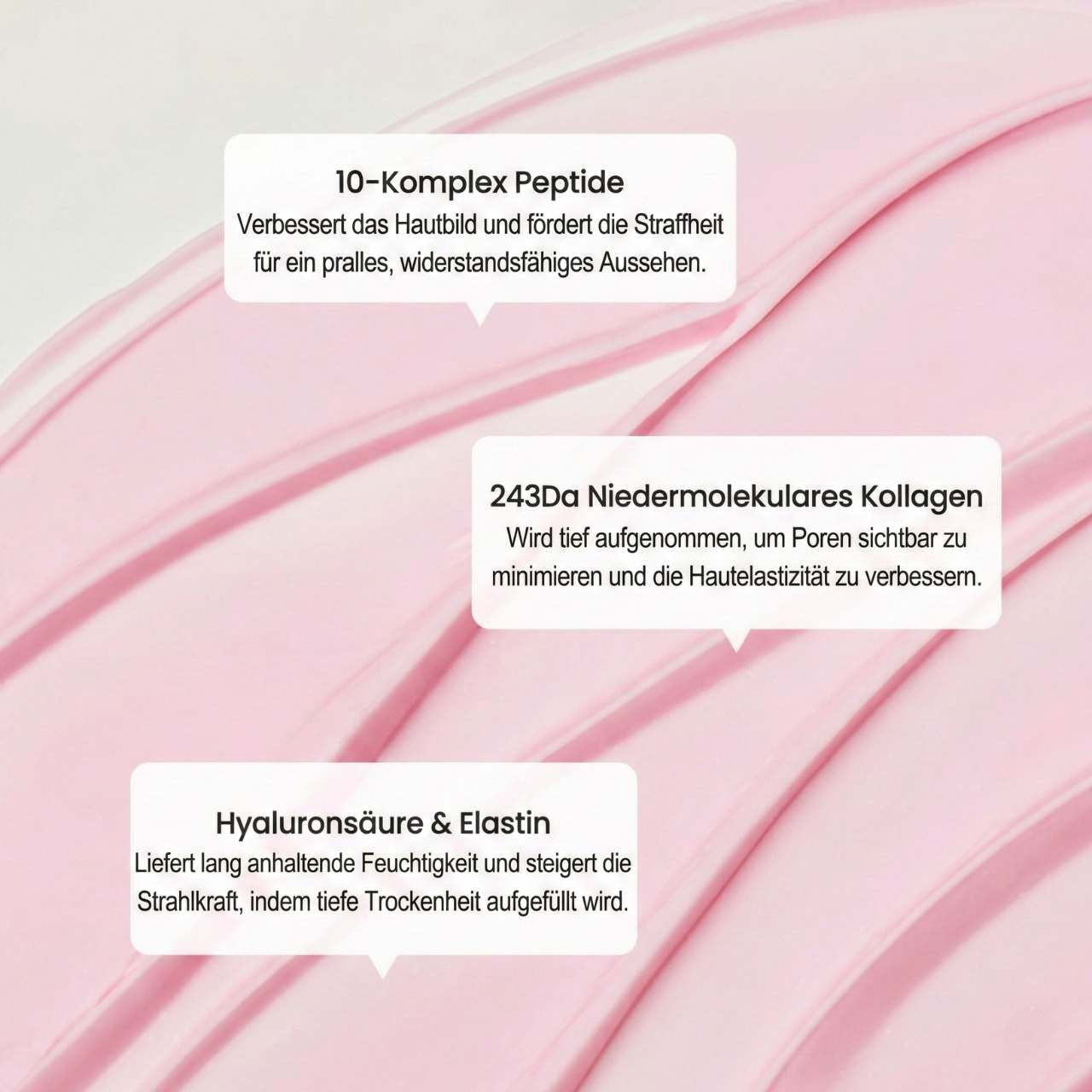 Collagen Water, Glycerin, Methylpropanediol, Diphenyl Dimethicone, Neopentyl Glycol Diheptanoate, Triethylhexanoin, 1,2-Hexanediol, Cetearyl Alcohol, Niacinamide, Hydrogenated Polydecene, Simethicone, Cetearyl Olivate, Hydrogenated Poly(C6-14 Olefin), Glyceryl Stearate, Sorbitan Olivate, Dimer Dilinoleyl Dimer Dilinoleate, Water, Sodium Acrylate/Sodium Acryloyldimethyl Taurate Copolymer, Polyisobutene, Sodium Polyacrylate, Ethylhexylglycerin, Adenosine, Caprylyl/Capryl Glucoside, Sorbitan Oleate, Disodium EDTA, Panthenol, Cyanocobalamin, Water, Tocopherol, Propanediol, Butylene Glycol, Collagen Extract, Sodium Hyaluronate, Alginic Acid, Pentylene Glycol, Silanetriol, Caprylyl Glycol, Elastin, Hydroxypropyltrimonium Hyaluronate, Hydrolyzed Elastin, Soluble Elastin, Sodium Acetylated Hyaluronate, Hydrolyzed Hyaluronic Acid, Hyaluronic Acid, Hydrolyzed Sodium Hyaluronate, Sodium Hyaluronate Crosspolymer, Potassium Hyaluronate, sh-Oligopeptide-1, Tripeptide-1, Hexapeptide-12, Hexapeptide-9, Palmitoyl Tripeptide-5, Pentapeptide-4, Palmitoyl Tripeptide-38, Palmitoyl Pentapeptide-4, Acetyl Hexapeptide-8, Copper Tripeptide-1